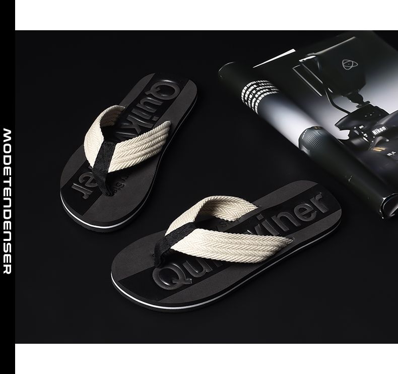 brug denne afslappede flip flop og nyd weekenden. flip-flops er designet med et bredt bånd, den slidstærke og åndbare stofrem er blød at røre ved, indersålen er dekoreret med et dybtrykslogo, indersålen har buestøtte, og gummisålen er holdbar og holdbar.
