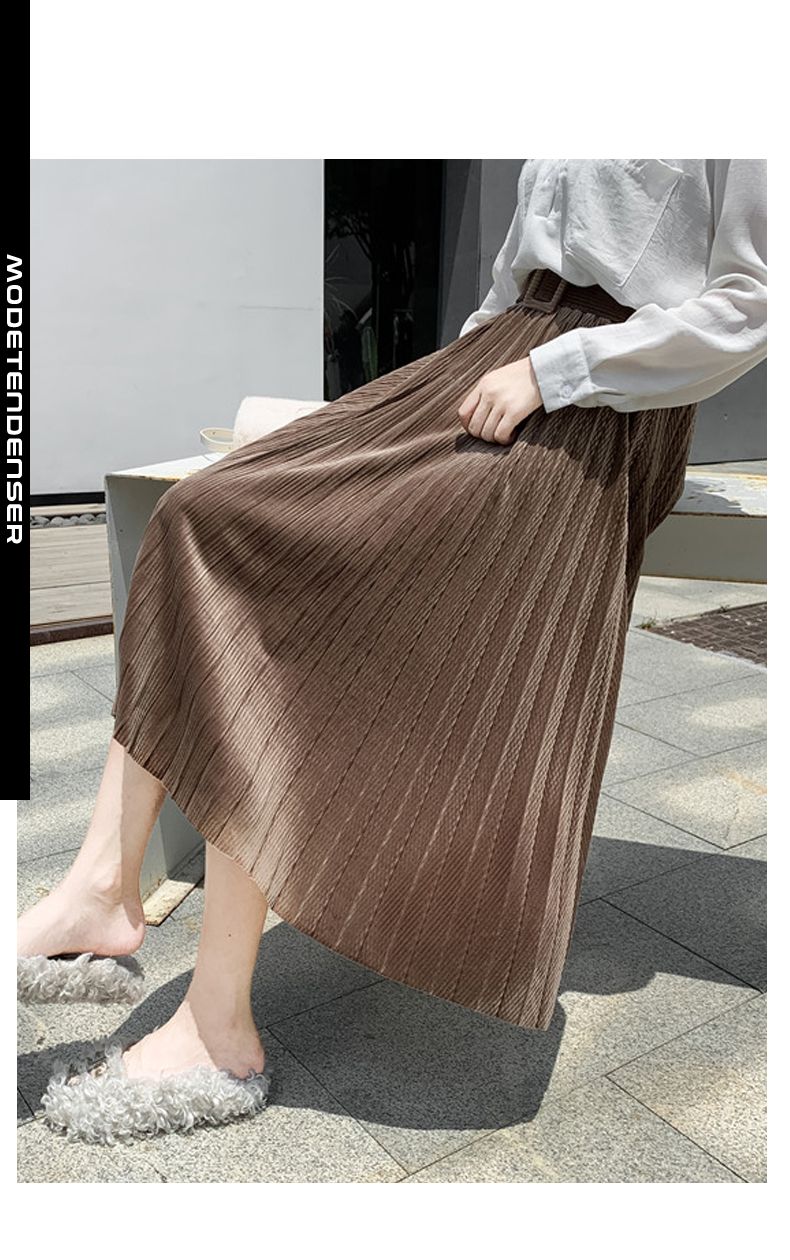 dette er en elegant knælang plisseret nederdel, lavet af materialer af høj kvalitet, som kan skabe unikke og smukke naturlige fibre. dette moderigtige kvinders nederdel antager de naturlige toner på himlen og et firkantet spænde bælte med naturlige og glatte perfekte detaljer, der bringer et elegant og charmerende udseende.