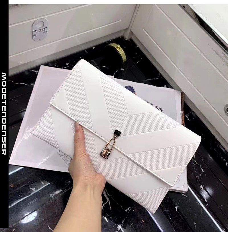 denne smukke koblingstaske tilføjer et strejf af højdepunkt til din begivenhedsredigering. det er præget med et dristigt v-formet læder og er dekoreret med en lås på forsiden. det har et ikonisk udseende, og det overordnede temperament er relativt ædelt. der er nok plads indeni til at gemme vigtige nøgler, telefoner og kort. hvis du vil være håndfri, kan du også bruge en kædestrop. du kan klippe den fast på din arm eller bære den med en skulderrem og derefter krydse den.