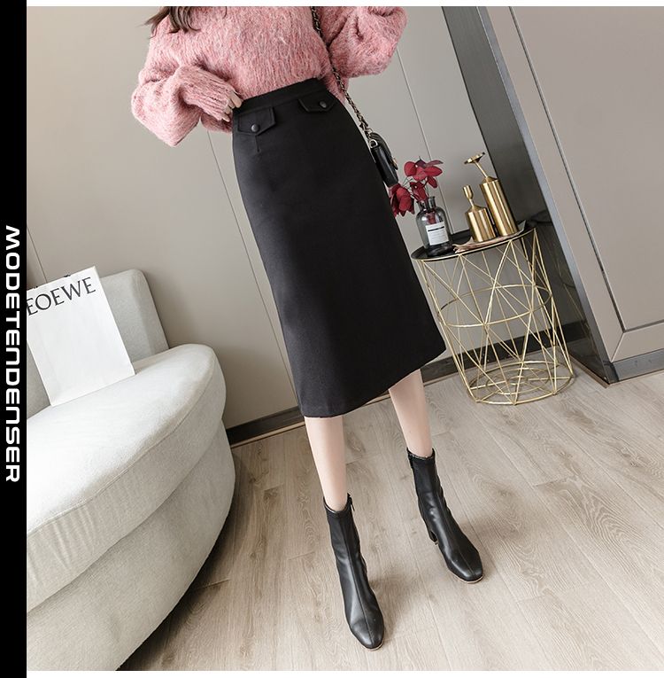 denne plisserede nederdel er enkel i stil. denne knælange uldkvindes korte nederdel har en høj talje, en solid farve og en knapklap, der dækker folderne, og kan bæres ned, så den passer til dagen. denne lange skræddersyede nederdel med en behagelig sweater og et par sko er et ideelt valg til mode.
