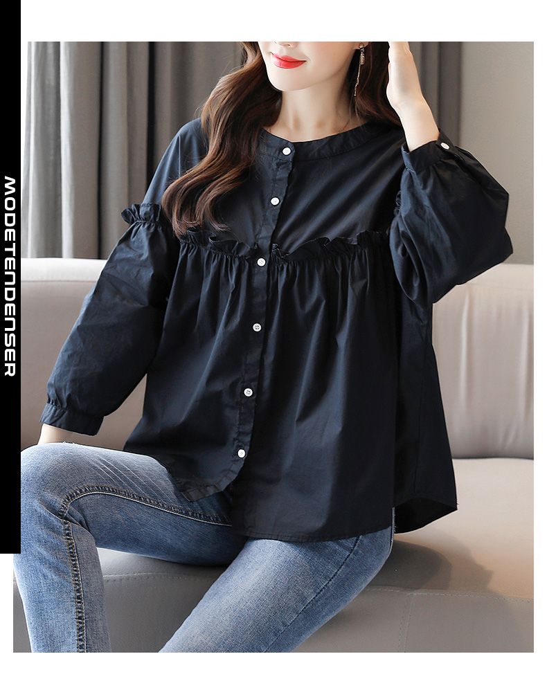 denne sæson er frisk og elegant bluse. lotusbladet på brystet og armene og de fulde knapper på fronten fascinerer dig med sin glatte måde. den afslappede, ensfarvede ensfarvede ensfarvede stil får dit udseende til at se frisk og sød ud. med sit udseende har hun alt, der frister os.